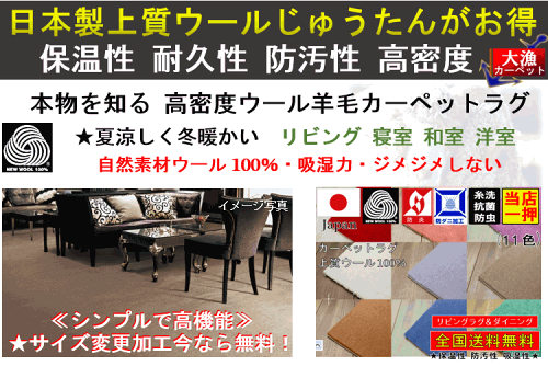 ウール 防炎 カーペット【ニュークライスト】12畳 352×522cm 特 徴 日本製 ウール 防炎 防ダニ 防虫 静電 抗菌 糸洗い ホットカーペット/床暖房対応 フリーカットOK 素 材:ウール100% 裏:麻貼り 毛 足:7mm 全 厚:約9mm 毛足形状:カットパイル どんなお部屋にも合わせやすいベーシックな丸巻きカーペットは糸の量が価格以上に目付され、お掃除もしやすく超高機能 ウール 防炎 防汚 抗菌 防ダニ 静電 防虫 国産だから安心安全! 更に糸洗い仕上げをしていますので一般的なウールに比べより防汚 撥水性を高め発色も綺麗になります。