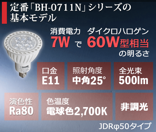 【2年保証】 LED電球 E11 非調光 電球色2700K 500lm 7W(ダイクロハロゲン60W相当) 中角25° JDRφ50タイプ あす楽対応 BH-0711N-WH-WW