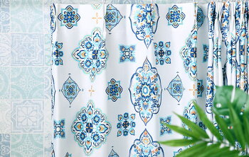 カラーバリエーションの詳細 ブルー クリックで拡大 >ブルーとイエローのコントラストが美しいモロッコタイル模様の非遮光カーテン〜ガミラブルー〜