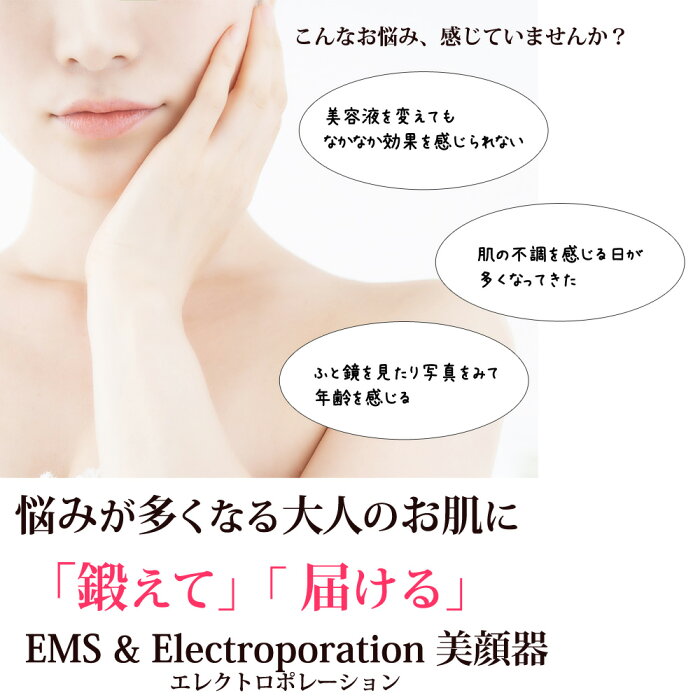 EMSエレクトロポレーション美顔器 お悩みが多くなる、大人のお肌に 自宅で本格エステのような複合ケア! ■4つの機能が一度に! 理想の美肌を目指す複合美顔器 1. EMS 引き締め 微弱な電流で、顔の筋肉にアプローチ。