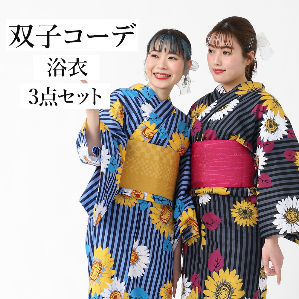 双子コーデ浴衣 平織 3点セット 浴衣 帯 19柄 下駄 大人 セット 女性 レディース 【 シンプル 浴衣帯 桐下駄 女性用 レトロ おしゃれ かわいい 可愛い 夏 ゆかた yukata 朝顔 ストライプ 金魚 縞 ひまわり チューリップ 桜 牡丹 菊 水彩 黒 紺 赤 水色 ブルー フェミニン 】