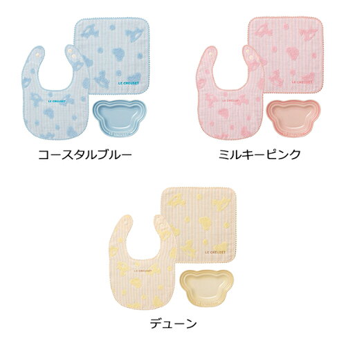 商品情報 [ベビー・ミニタオル] ・幅22.5×縦22.5cm [ベビー・スタイ] ・縦17.5(首下部分)×横22.5cm ・首周り最大36cmまで対応 ※綿100% [ベビー・ベアー・プレートS] ・縦8.5×横12.5×高さ2cm ・重量110g ※こちらの商品は、ル・クルーゼショップ限定です。