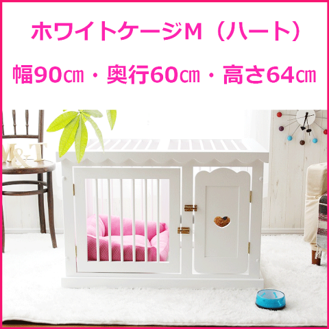 商品の説明です 商品名 【送料無料】【ホワイトケージM(ハート)】デザインは(ハート)と(肉球)の2種類 サイズ 外側:幅90センチ、奥行き60センチ、高さ64センチ 内側:幅82センチ、奥行き52センチ、高さ57センチ 材質 主要材:MDF(木の粉を固めた合板)材料の厚さ18ミリ 丸棒:直径12ミリ 塗料 ウレタン塗装(白ツヤ消し) ウレタン塗装は表面の美しい仕上がりが特徴です。