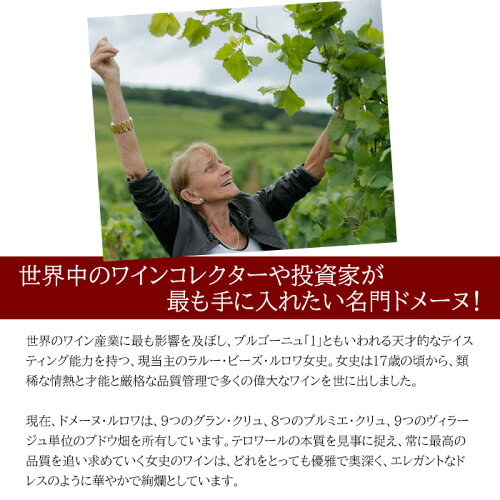 【それぞれの場面に合うワインをたくさんご用意しています】 ギフト プレゼント お中元 御中元 お盆 お礼 クリスマス 夏ギフト 冬ギフト お歳暮 御歳暮 お年賀 御年賀 お正月 年末年始 ご挨拶 バレンタイン ホワイトデー お返し 父の日 母の日 敬老の日 贈答品 お土産 手土産 おみやげ 差し入れ 御祝 御礼 内祝い 引き出物 お祝い 結婚祝い 結婚 出産 出産祝い 卒業 進学 入社 退職 進学祝い 誕生日 お誕生日 誕生日祝い バースデー バースデイ Wedding ウェディング ホームパーティ ホームパーティー お花見 パーティ パーティー 就任 お酒 酒 アルコール世界中のワインコレクターや投資家が最も手に入れたい名門ドメーヌ! ドメーヌ ルロワ DOMAINE LEROY 幻のワインを手掛ける「ラルー・ビーズ・ルロワ女史」 世界のワイン産業に最も影響を及ぼし、ブルゴーニュ「1」ともいわれる天才的なテイスティング能力を持つ、現当主のラルー・ビーズ・ルロワ女史。